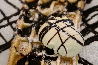 Waffel „Eierlikör“ Heiße Waffel mit Puderzucker und Schokoladeneis, Eierlikör und Schokosauce |
